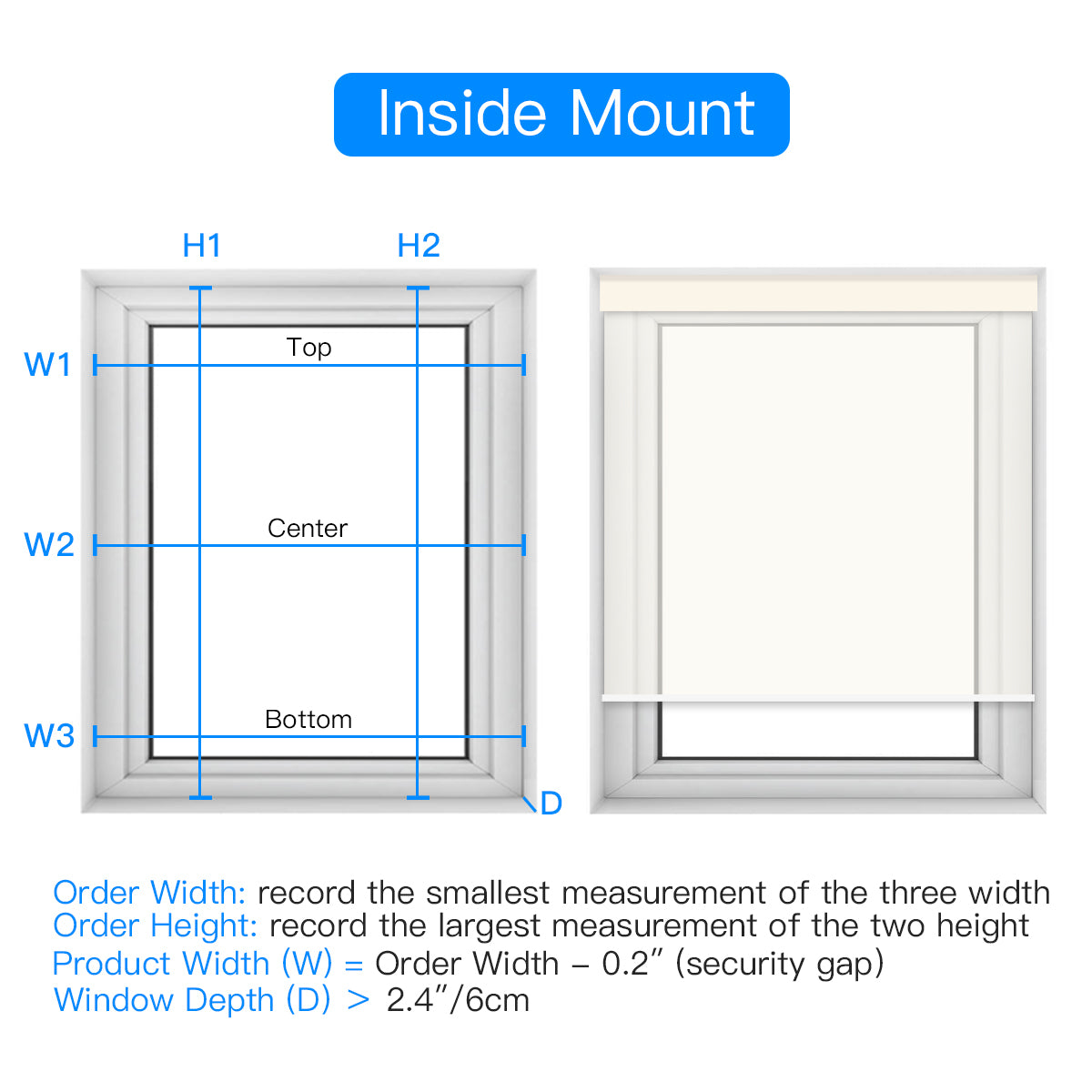 Stellen Sie sicher, dass der Fensterrahmen für die Innenmontage ausreichend tief ist. Bei einer Tiefe von weniger als 1,5 Zoll muss das Rollo außen montiert werden.