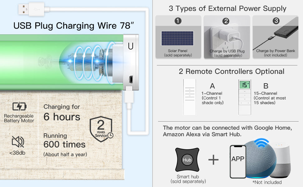 Der Motor ist nach der Installation für die Fernbedienung vorprogrammiert. Für Alexa oder Google Assistant wird ein Funk-Hub benötigt. Verwenden Sie ein Solarpanel zum Aufladen, wenn das Fenster weit von einer Steckdose entfernt ist (1 Panel pro Jalousie).