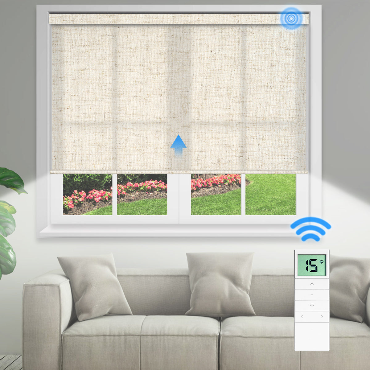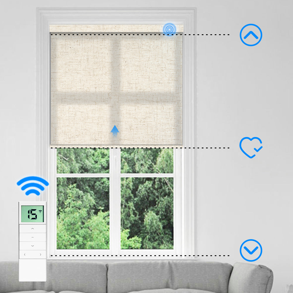 Das Rollo lässt sich mühelos per Fernbedienung heben und senken. Verbinden Sie einen Funk-Hub mit Alexa/Google für die Steuerung per Sprachbefehl, App oder Zeitplan.
