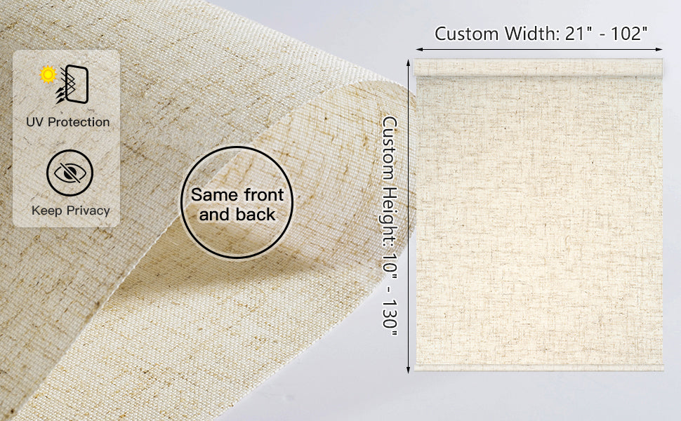 Dieses Material aus 50–70 % blickdichtem Polyestergewebe schützt vor UV-Strahlung und lässt gleichzeitig natürliches Licht durch. Es bietet hervorragende Privatsphäre, da es Einblicke von außen verhindert. Dank des kabellosen Designs ist es sicher für Kinder und Haustiere. Ideal für Wohnzimmer, Terrassentüren, Küchen, Büros und vieles mehr. Nur für den Innenbereich geeignet.