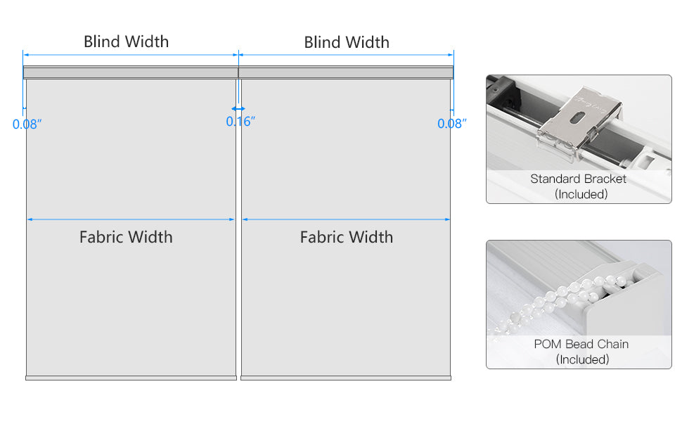 Der Stoff ist etwas schmaler (0,16 Zoll) als der Rollo, um eine reibungslose Bedienung zu gewährleisten. Jeder Rollo wird mit Standardhalterungen für eine problemlose Montage und einem Griff an der unteren Schiene für die bequeme tägliche Nutzung geliefert.