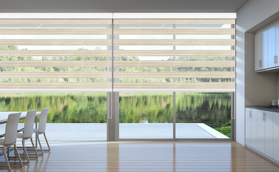 Material: Hergestellt aus 50–95 % blickdichtem, wasserdichtem Doppelschichtgewebe mit lichtdurchlässigem, transparentem Stoff und Polyesterstreifen. Der transparente Stoff filtert das Sonnenlicht sanft und ermöglicht den Blick nach draußen, während der Polyesterstreifen für Privatsphäre sorgt und den Lichteinfall weitgehend blockiert. Die Lichtstärke lässt sich durch die Stoffausrichtung regulieren. Für perfekt ausgerichtete Stoffstreifen bei mehreren Jalousien bestellen Sie diese bitte in einer einzigen Charge, damit sie in derselben Produktionscharge gefertigt werden. Ideal für Wohnzimmer, Terrassentüren, Büros und mehr. Nur für den Innenbereich geeignet.