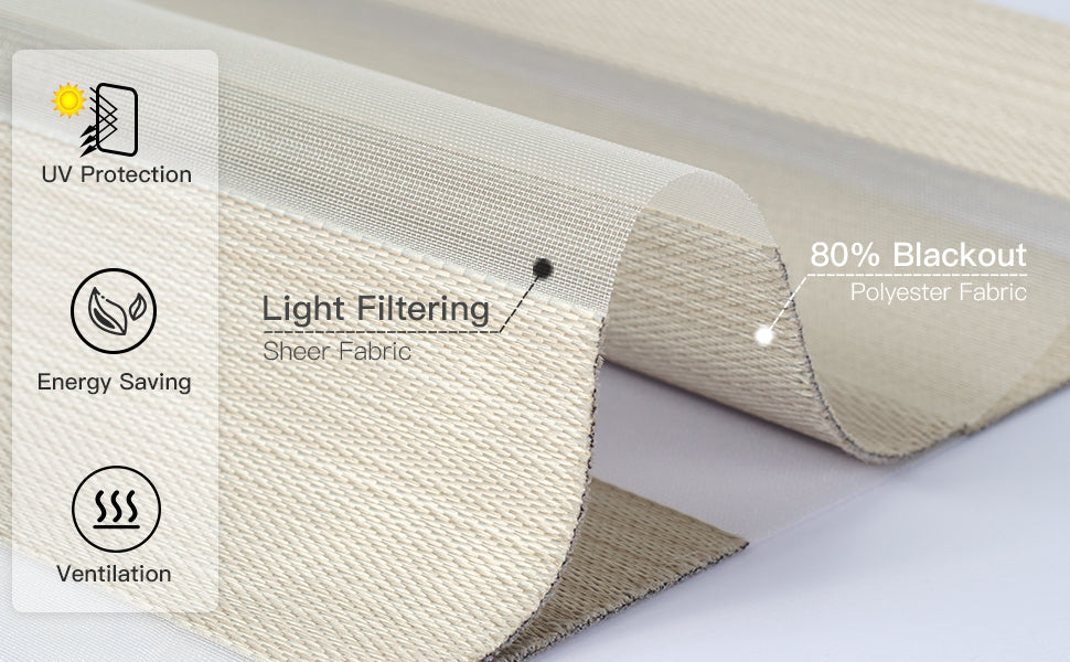 80 % Verdunkelung, wasserdicht, verstellbar, doppellagig, aus transparentem und gestreiftem Polyestergewebe. Das transparente Gewebe lässt sanftes Sonnenlicht herein und ermöglicht den Blick nach draußen, während das gestreifte Gewebe den größten Teil des Lichts abhält und für Privatsphäre sorgt.