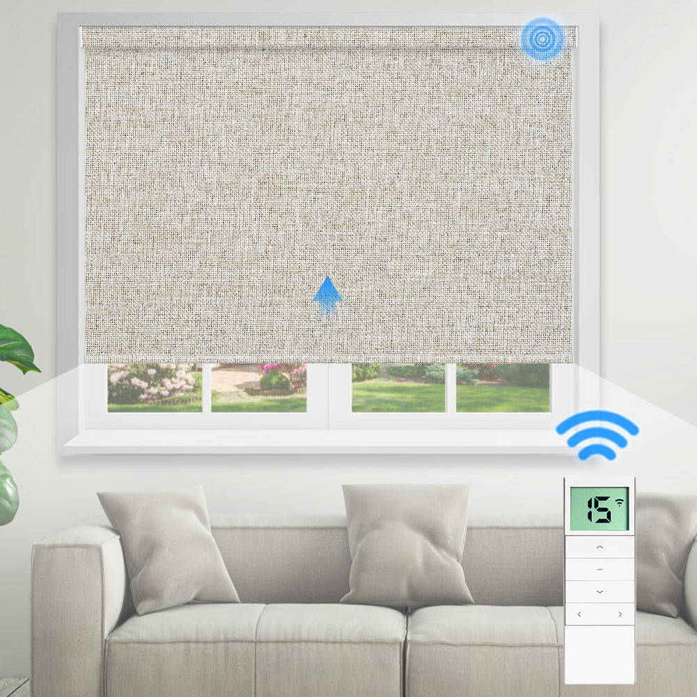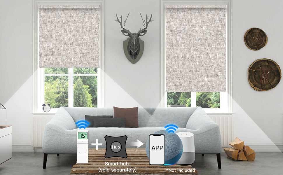 Das Rollo lässt sich mühelos per Fernbedienung heben und senken. Verbinden Sie einen Funk-Hub mit Alexa/Google für die Steuerung per Sprachbefehl, App oder Zeitplan.