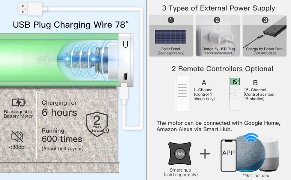 Der Motor ist nach der Installation für die Fernbedienung vorprogrammiert. Für Alexa oder Google Assistant wird ein Funk-Hub benötigt. Verwenden Sie ein Solarpanel zum Aufladen, wenn das Fenster weit von einer Steckdose entfernt ist (1 Panel pro Jalousie).