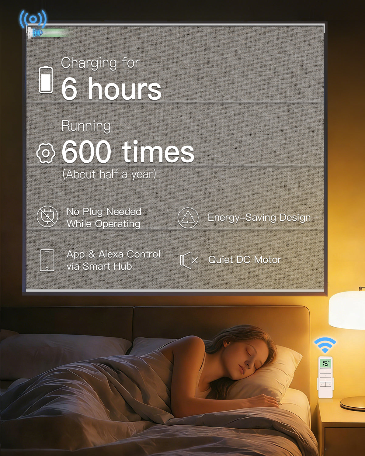 - 10O% Blackout & Privacy – Motorized blackout Roman shades made of durable polyester with the same finish on both sides. Effectively block light, UV rays, and noise, improve energy efficiency, and ensure privacy. Cordless electric Roman blinds are safe for children and pets. Ideal window shades for bedroom, living room, and office. Indoor use only.
