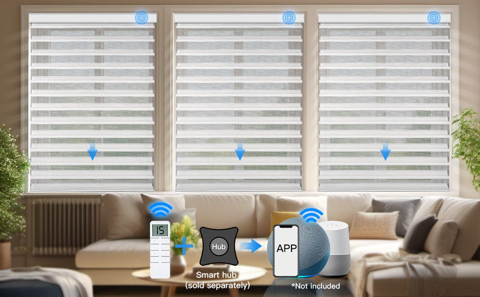 Die motorisierten Shangri-La-Rollos von Tokblind ermöglichen Ihnen eine komfortable Lichtsteuerung. Heben oder senken Sie das Rollo einfach per Fernbedienung. Für die Steuerung per Sprachbefehl, App oder Timer verbinden Sie die Rollos über einen Funk-Hub mit Alexa oder Google Assistant.
