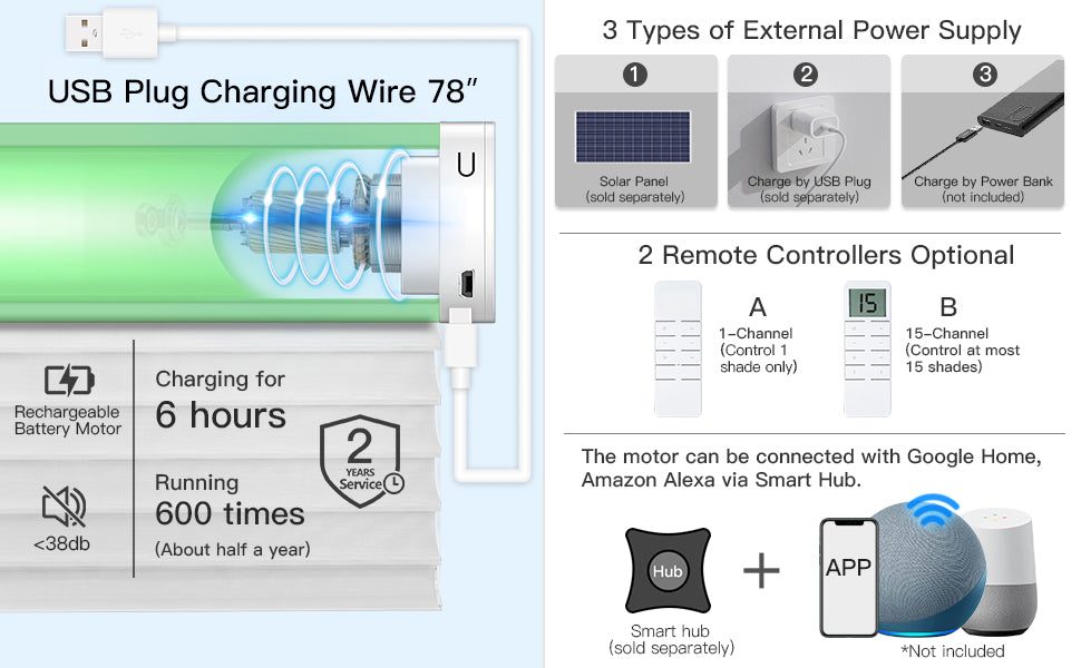 Der vorprogrammierte Motor funktioniert direkt nach der Installation mit der Fernbedienung. Für die Verbindung mit Alexa oder Google ist ein Funk-Hub erforderlich. Bei Problemen mit dem Aufladen kann ein Solarpanel hinzugefügt werden – ein Panel versorgt eine Jalousie mit Strom.