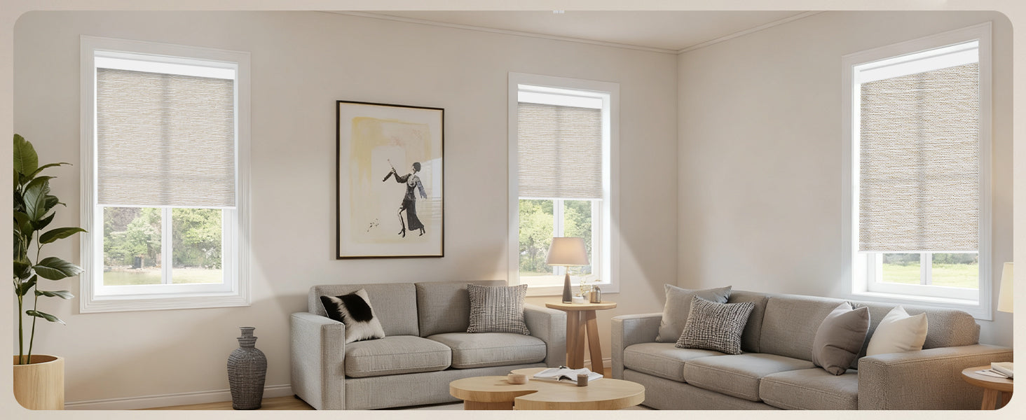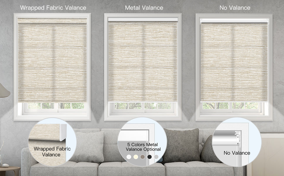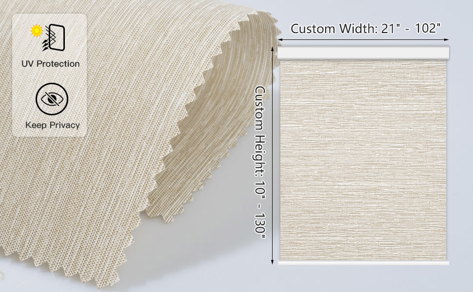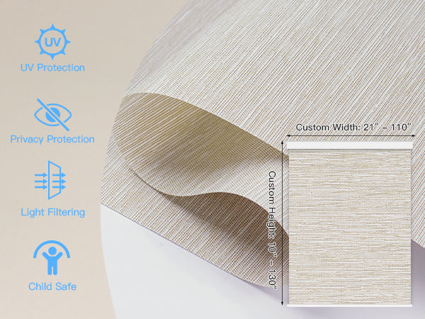 Das lichtdurchlässige Polyestergewebe blockiert UV-Strahlen, filtert das natürliche Licht und sorgt für Privatsphäre. Wenn Sie sich bezüglich der Farbe unsicher sind, empfehlen wir Ihnen, ein Stoffmuster zu bestellen.