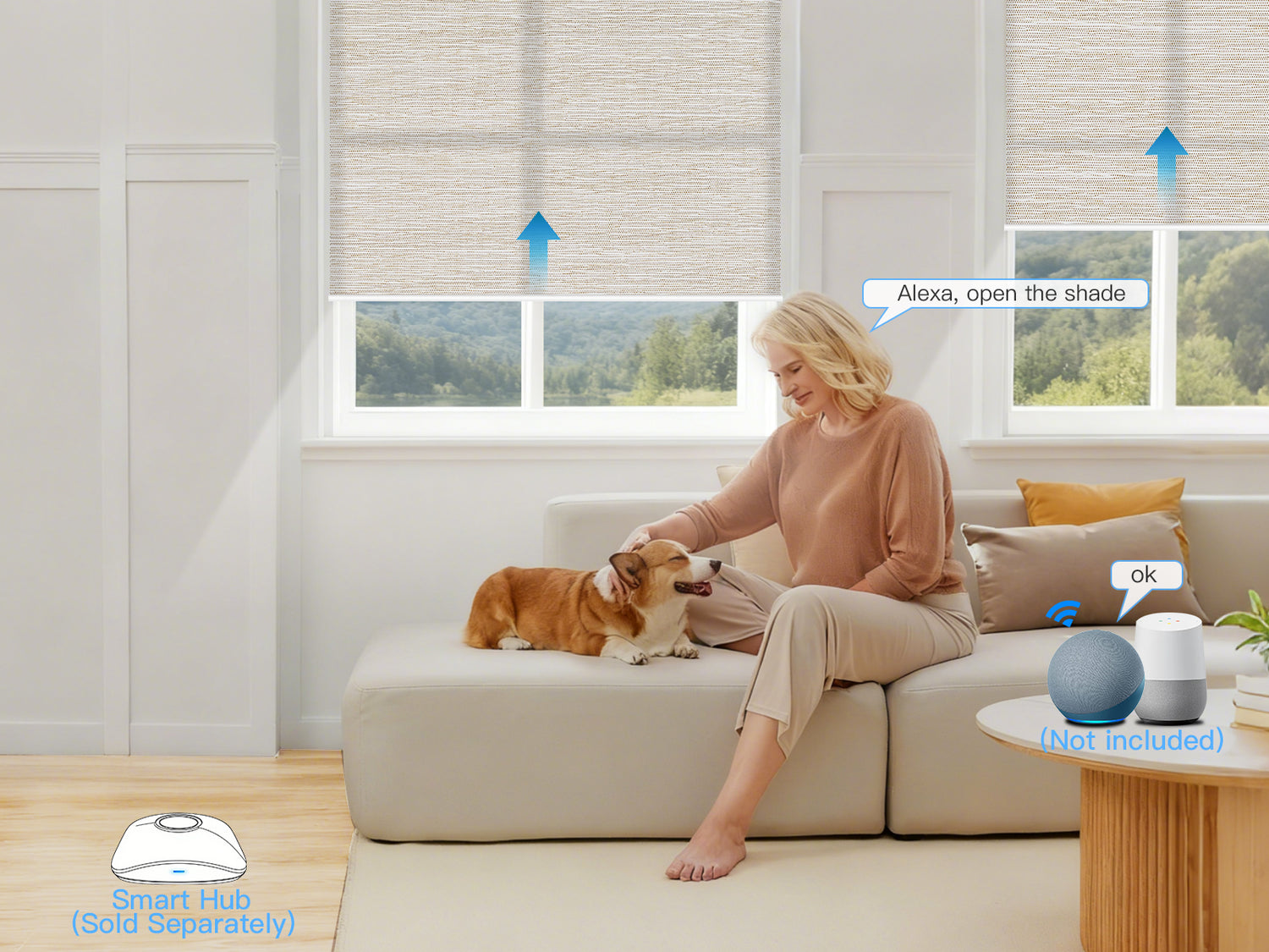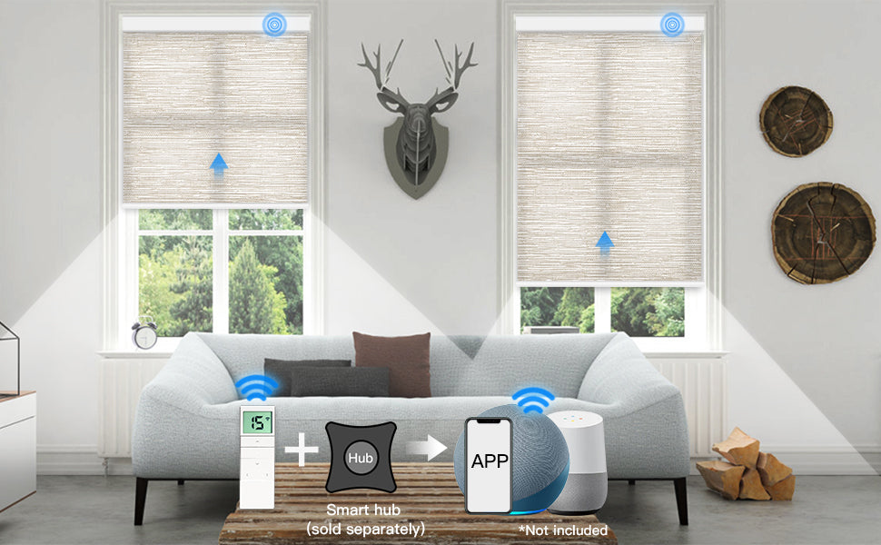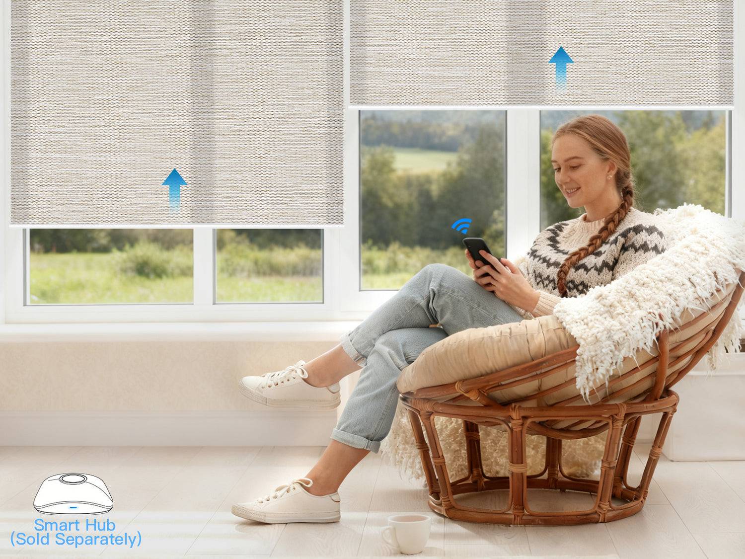Das Rollo lässt sich mühelos per Fernbedienung heben und senken. Verbinden Sie einen Funk-Hub mit Alexa/Google für die Steuerung per Sprachbefehl, App oder Zeitplan.
