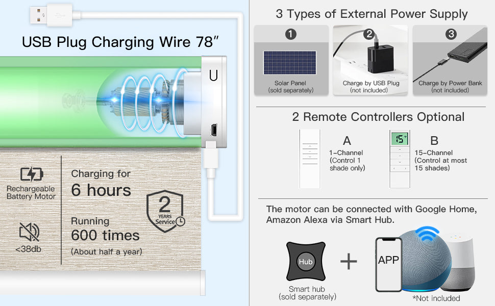 Der Motor ist nach der Installation für die Fernbedienung vorprogrammiert. Für Alexa oder Google Assistant wird ein Funk-Hub benötigt. Verwenden Sie ein Solarpanel zum Aufladen, wenn das Fenster weit von einer Steckdose entfernt ist (1 Panel pro Jalousie).