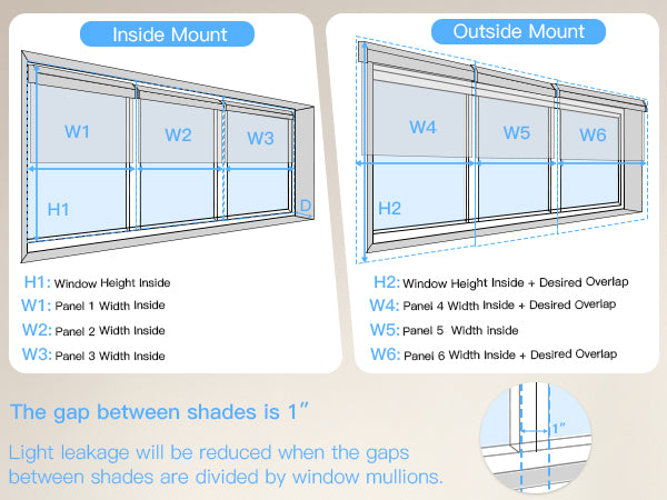 Die Stoffbreite ist 1 Zoll kürzer als die Breite des Rollos. Bei der Montage zweier Rollos nebeneinander entsteht ein 1 Zoll breiter Spalt zwischen den Stoffen, selbst wenn die Blenden/Halterungen bündig ausgerichtet sind.