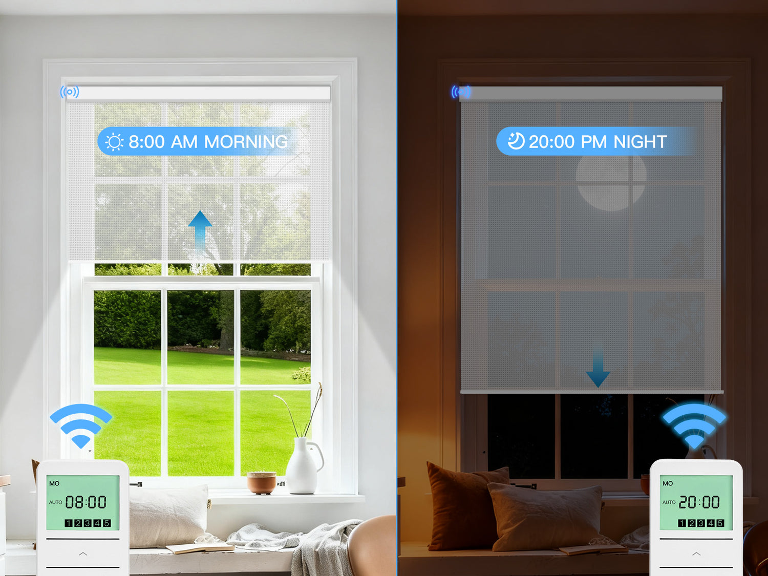 The optional shade timer remote lets you set precise open and close schedules, with smart control for a more convenient daily routine.