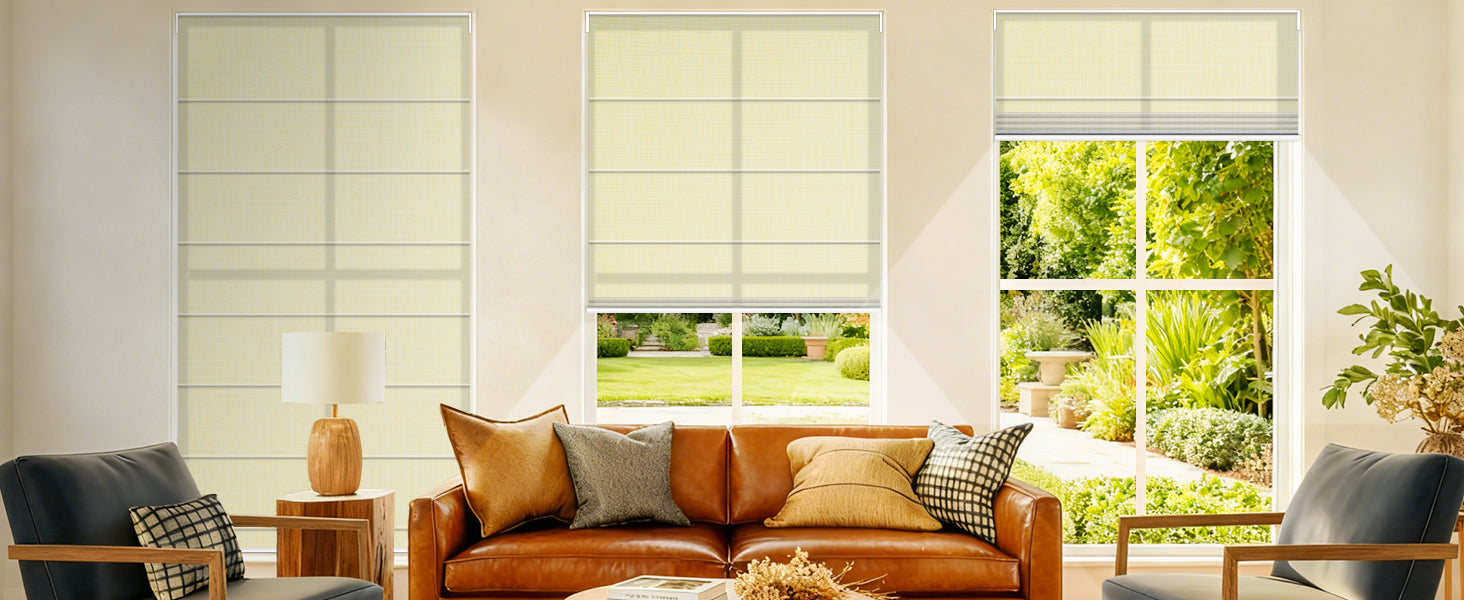 Light-filtering Roman shades provide about 50% light reduction, softly diffusing sunlight while maintaining privacy and UV protection. Elegant jacquard texture adds warmth without fully darkening the room. Cordless motorized design is safe for kids and pets. Indoor use only.