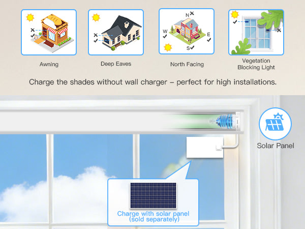 Rechargeable motor lasts 3–6 months per charge. Optional solar panel available. Compatible with Alexa & Google Home via RF hub (required). Multiple remote control options for easy daily use.