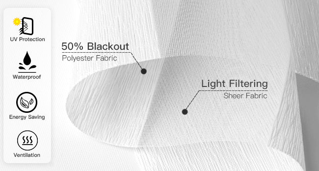 50 % Verdunkelung, wasserdicht, verstellbar, doppellagig, aus transparentem und gestreiftem Polyestergewebe. Das transparente Gewebe lässt sanftes Sonnenlicht durch und ermöglicht den Blick nach draußen, während das gestreifte Gewebe den größten Teil des Lichts abhält und für Privatsphäre sorgt.