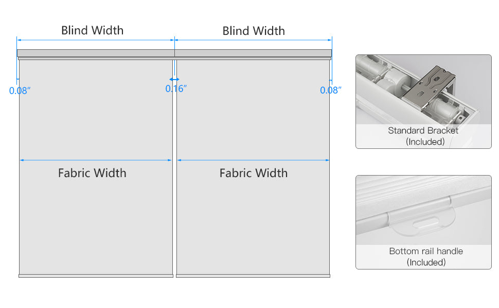Der Stoff ist etwas schmaler (0,16 Zoll) als der Rollo, um eine reibungslose Bedienung zu gewährleisten. Jeder Rollo wird mit Standardhalterungen für eine problemlose Montage und einem Griff an der unteren Schiene für die bequeme tägliche Nutzung geliefert.